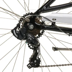 - Simple 7 speed Shimano Tourney drivetrain controlled with a twist shifter offers a wide range of gears without being complicated