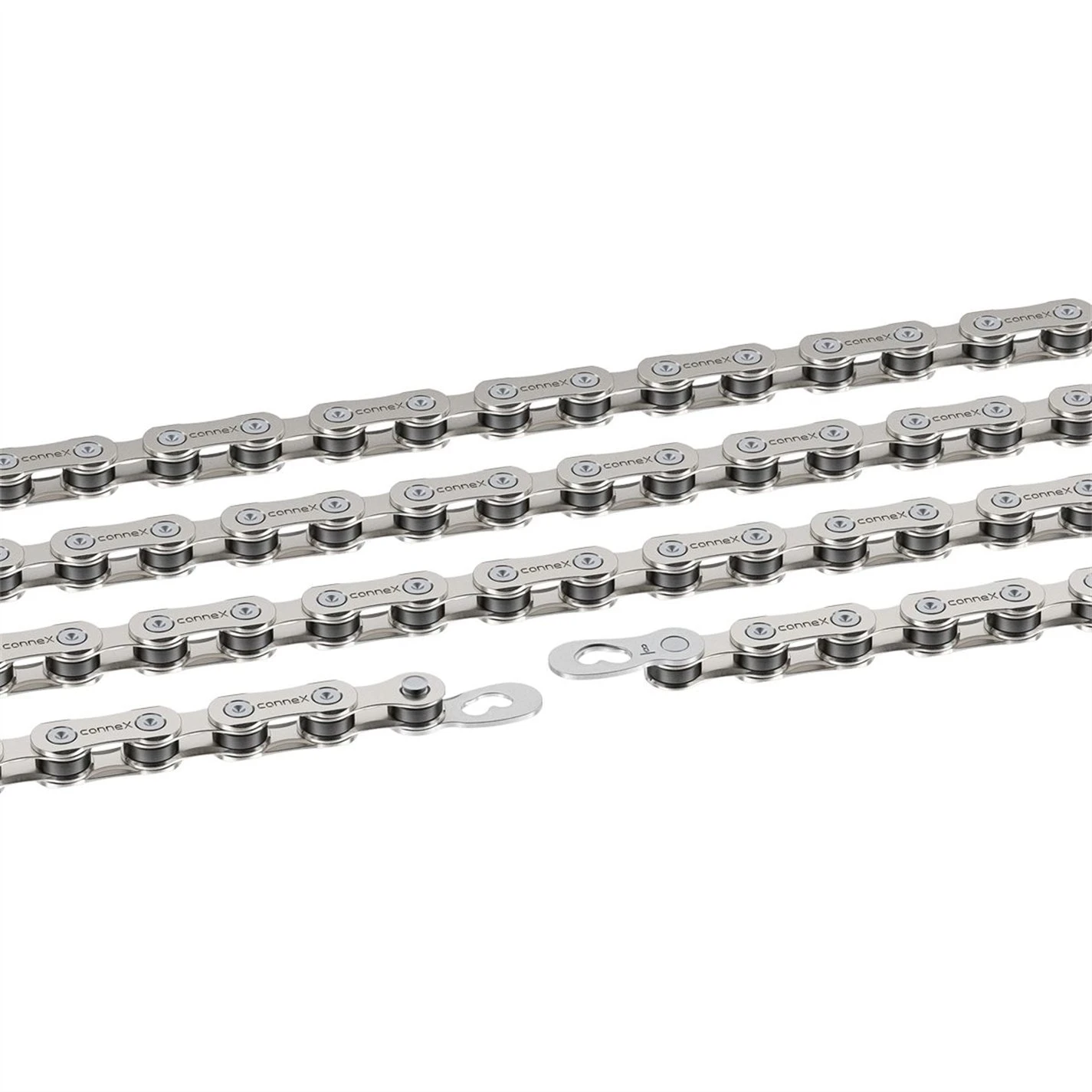 > Effective protection against corrosion and a precious look due to fully nickel-coated inner and outer plates. > For all 8-speed drive systems on the market > 1/2 x 3/32, pin length: 7.2mm > Weight: 308g/110 links > Inc Connex Link
