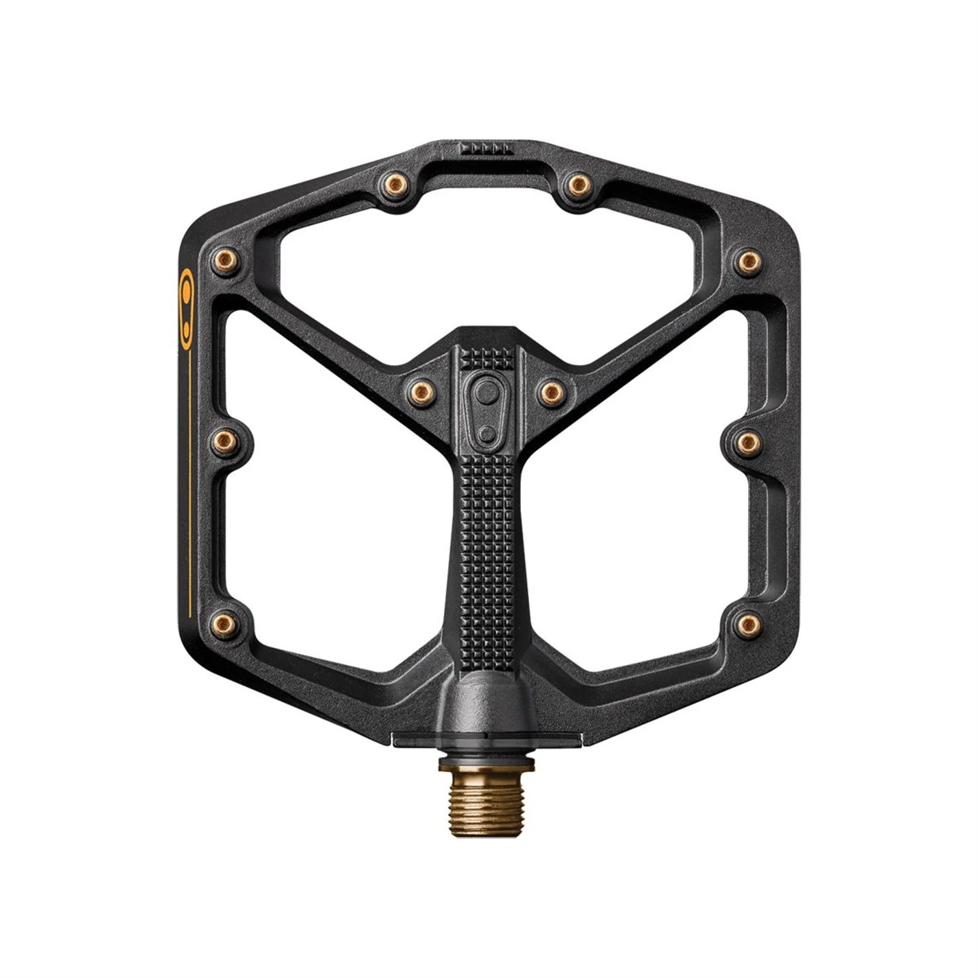 > Concave pedal platform so that your shoe feels like it sits into the pedal and feels connected. > 13mm external and 11mm internal thickness. > Titanium axle. > 20 adjustable gold pins per pedal. 8mm in the centre of the pedal and 10mm on the outer edges. > Internals run on an igus LL-glide bearing which has been exclusively formulated for crankbrothers and performs in even the most adverse conditions out on the trails. > Small: 100mm x 100mm pedal body footprint > Large: 114mm x 111mm pedal body footprint