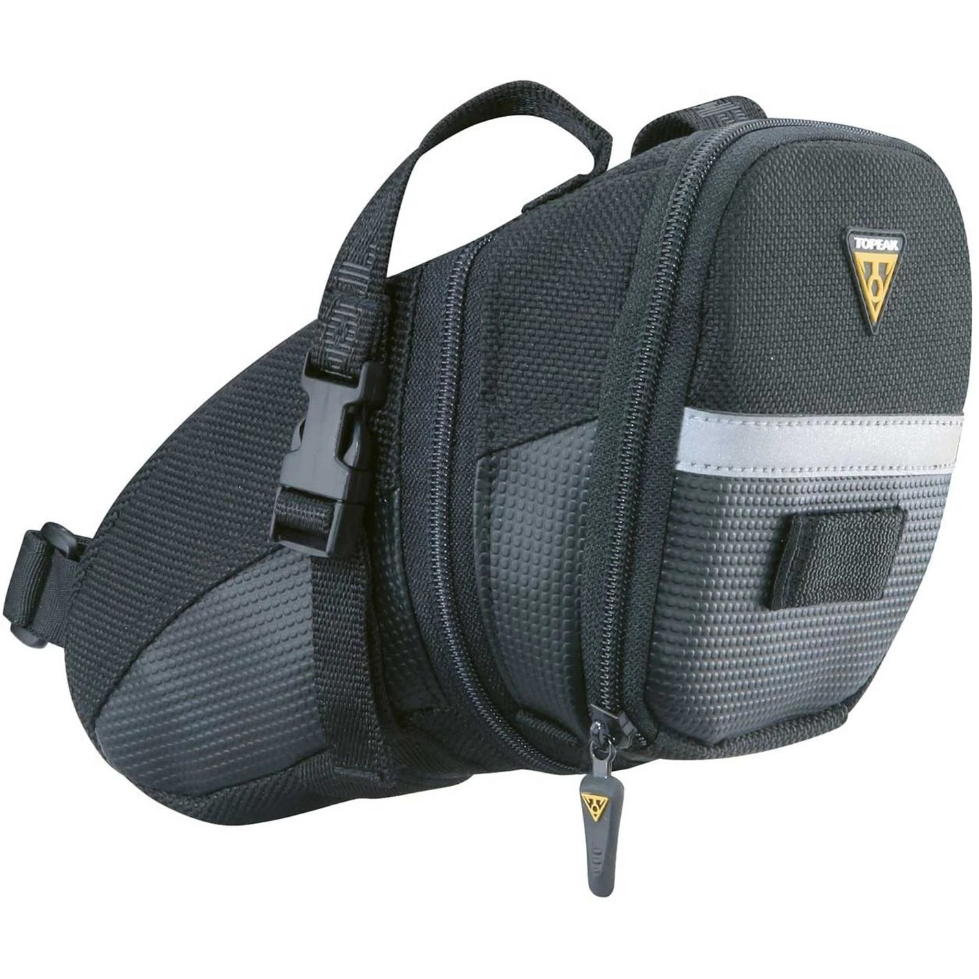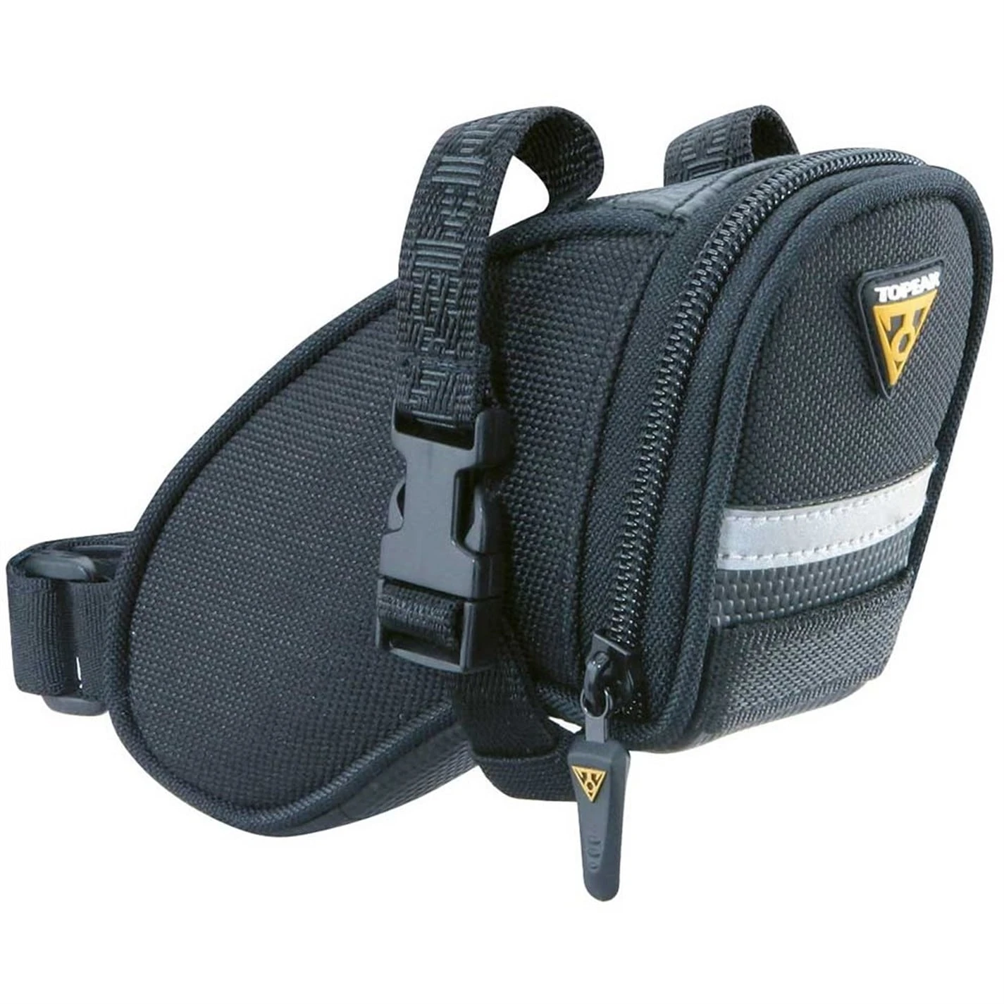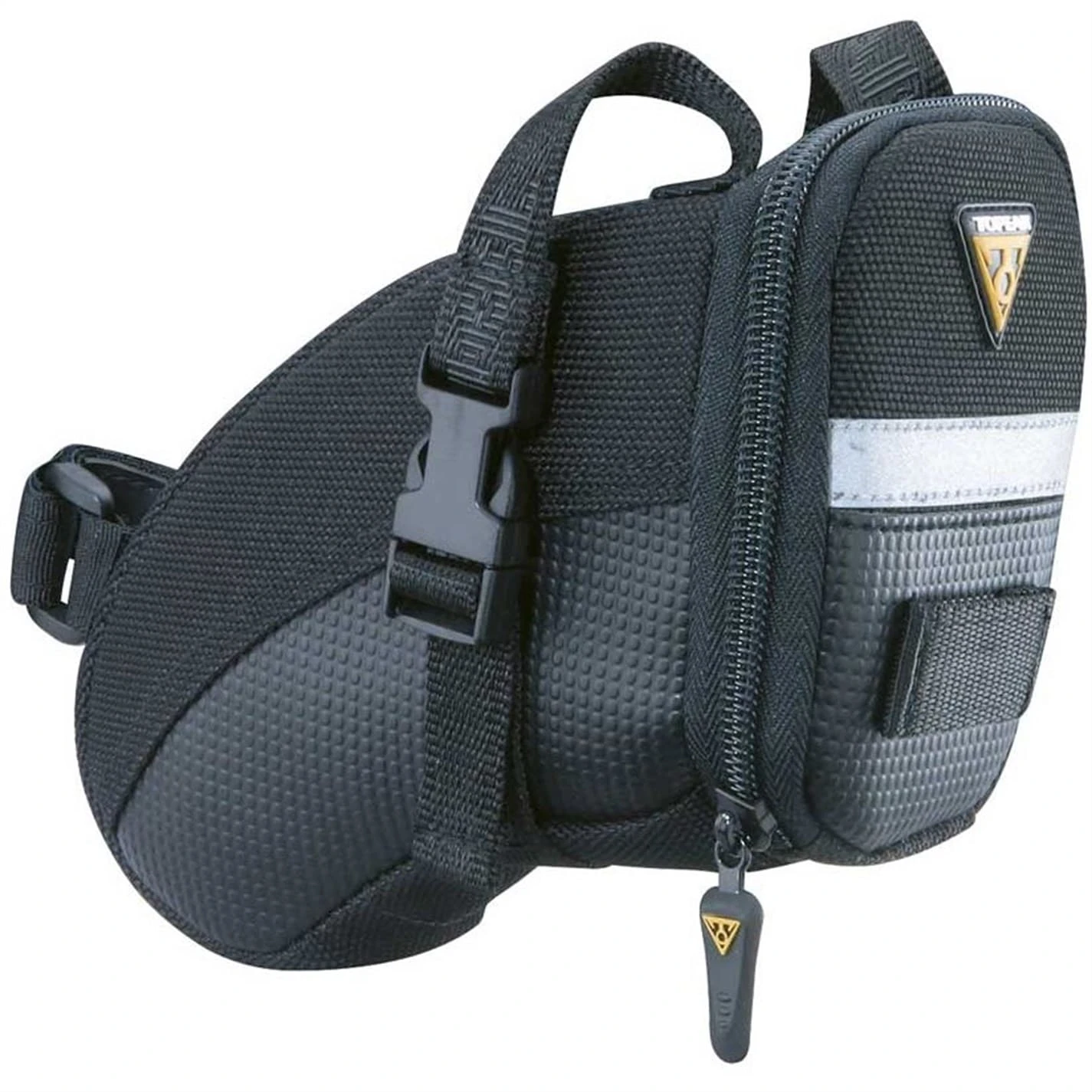 The Topeak Aero Wedge is an aerodynamic seat bag that can hold tubes, tools and other repair items, for those annoying punctures and repairs you may get out and about. It mounts with the innovative Quick Release Buckle system to fit all railed saddles. Four sizes offered to exactly fit rider’s needs.