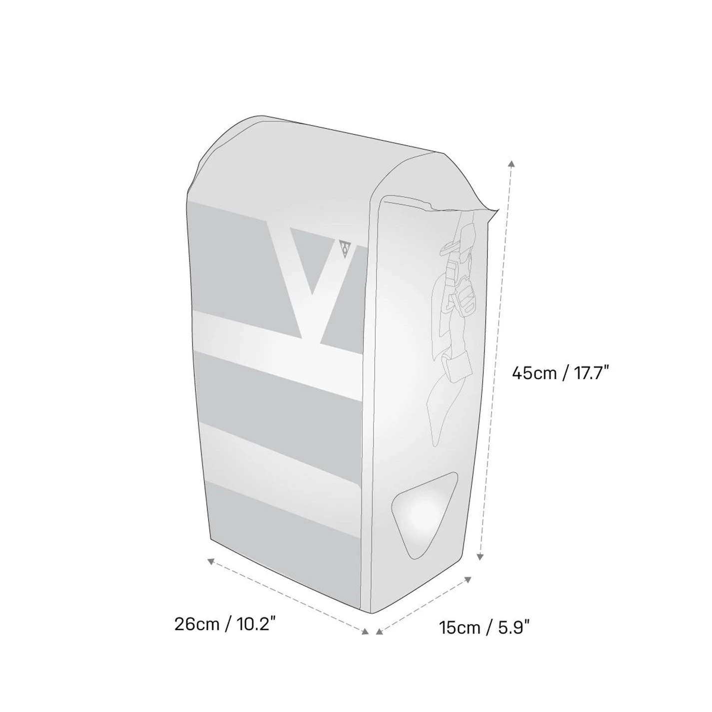 > CAPACITY: 16 L (Per single bag) > MATERIAL: Waterproof fabric sonically welded seams > BAG ATTACHMENT: Handle Loc system, Fits racks 8 / 10 / 12 / 16 mm > ADDED FEATURES: Roll-top closure, Shoulder strap, Reflective printing > SIZE: 45 x 26 x 15 / 17.7 x 10.2 x 5.9 (15 L / Closure) > WEIGHT: 700 g / 1.54 lb (16 L)