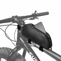 A hard shell, weatherproof top tube mounted bag features a streamlined shape to eliminate leg contact. Large capacity zippered compartment gives cyclists quick and easy access to energy bars, smartphone, tools or any small essential gear they need.