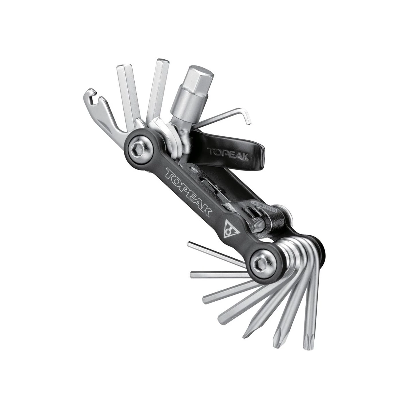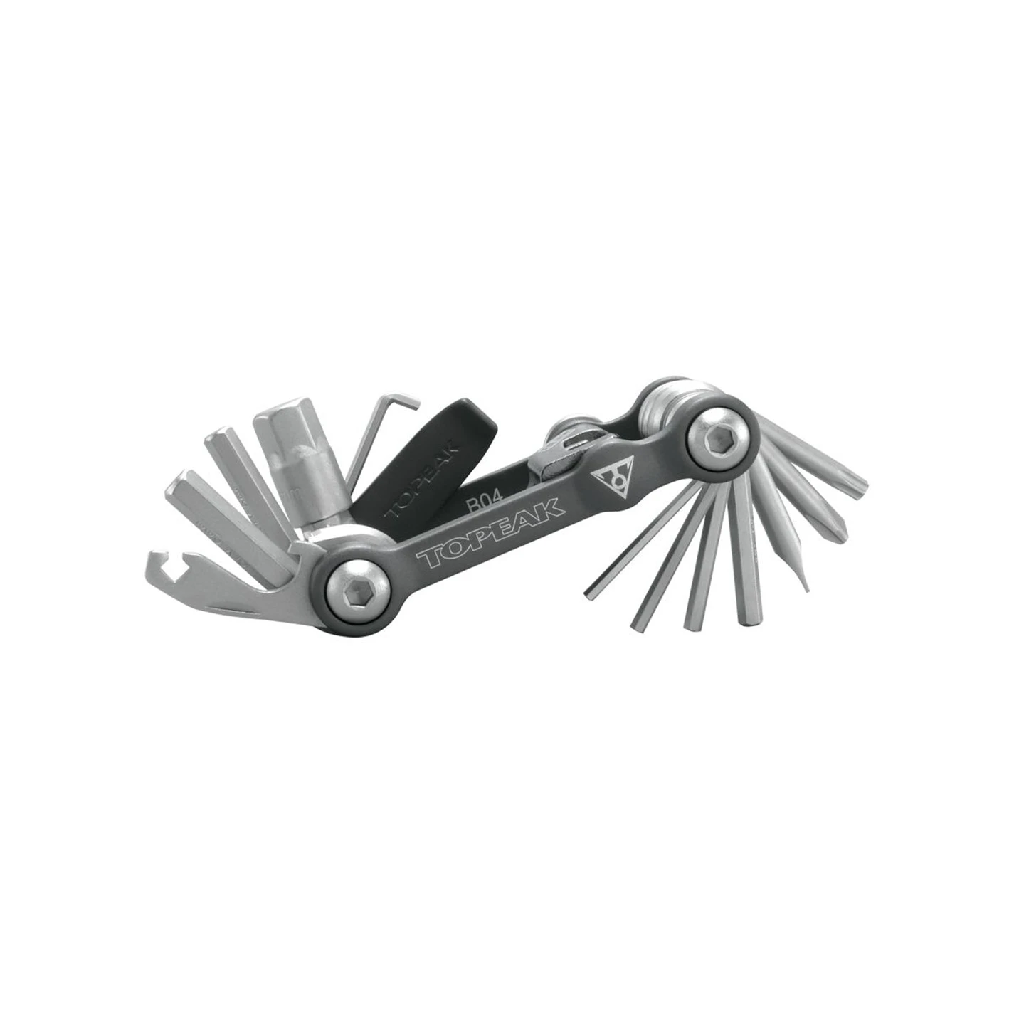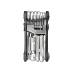 The Topeak Mini 18 Compact Tool is a one piece ultralight folding tool – 2 2.5 3 4 5 6 8 10 mm Allen keys and Torx wrench – Spoke wrenches 15g/14g and Phillips and Flat Screwdrivers – Chain tool and tyre lever – 182g and comes with small neoprene bag.