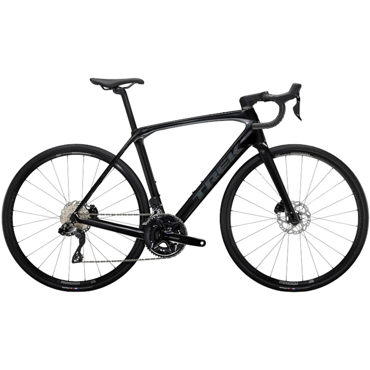 - Hubs: (F) Bontrager Paradigm Comp 25, 100×12 mm thru axle (R) Bontrager Paradigm Comp 25, Tubeless Ready, 25mm rim width, Shimano 11/12-speed freehub, 142×12 thru axle